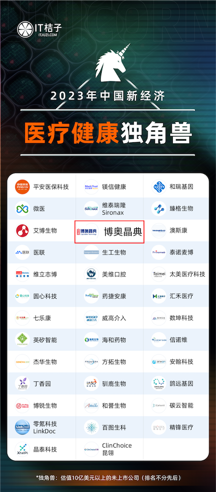 1月18日,新經(jīng)濟創(chuàng)投數(shù)據(jù)服務商 IT 桔子正式發(fā)布《2023年中國新經(jīng)濟獨角獸企業(yè)》系列重磅榜單。博奧晶典憑借在醫(yī)療健康領域的持續(xù)深耕及領先行業(yè)的卓越創(chuàng)新能力,榮登2023年中國新經(jīng)濟榜單,再獲行業(yè)權(quán)威認可。