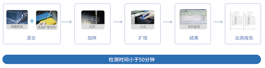 本儀器將微流控技術與恒溫擴增技術完美結合,可在50分鐘內完成樣本的核酸檢測,且通量高,每臺儀器一次可檢測四張芯片。在使用過程中,將從待測樣本中提取的核酸與相關試劑混合后加入微流控芯片,通過加熱膜對微流控芯片進行加熱和恒溫控制,核酸樣品在恒溫條件下進行擴增。擴增過程中,探測器將接收到的熒光信號輸入計算機,配套軟件會將接收到的信號進行相應處理并繪制成實時曲線,檢測完成后自動進行結果判讀和顯示。