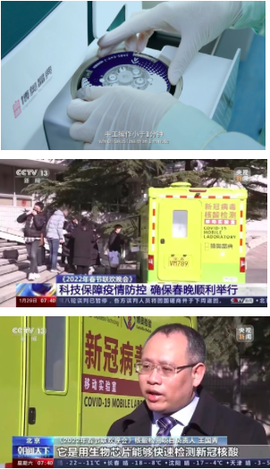 在2021、2022年央視春晚疫情防控工作中,以及2022年冬奧會開幕倒計時100天主題活動等重大活動中,“輕騎兵”均發(fā)揮了重要作用。這抹備受矚目的“晶典黃”是國內(nèi)首臺集采集和檢測為一體的移動式新冠病毒檢測實驗室,裝載基于全新一代先進的芯片實驗室(Lab-on-a-chip)設(shè)計理念,檢測時僅需將樣本保存液加入芯片,封閉芯片后即可上機,手工操作小于1分鐘。生物反應(yīng)全程(包括核酸提取、核酸純化、擴增反應(yīng)、核酸檢測和結(jié)果判讀等)均集成在一個整體密閉、內(nèi)部分區(qū)的微流控芯片內(nèi),由全自動核酸分析儀完成,因此無需專業(yè)分區(qū)實驗室,無需人工干預(yù),最大程度降低操作人員感染及樣本間交叉污染的風險。