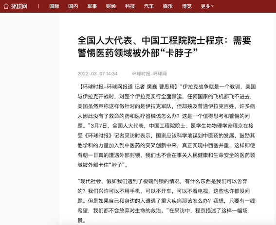 “伊拉克戰(zhàn)爭就是一個(gè)教訓(xùn),美國與伊拉克開戰(zhàn)時(shí),對整個(gè)伊拉克實(shí)行全面禁運(yùn),任何國家的飛機(jī)都飛不進(jìn)去,美國雖然聲稱這樣做針對的是伊拉克軍隊(duì),但卻殃及普通伊拉克百姓,許多病人因此沒有了救命的藥和醫(yī)療器械該怎么辦?這是一個(gè)值得思考和警惕的問題。”3月7日,全國人大代表,中國工程院院士、醫(yī)學(xué)生物物理學(xué)家程京在接受《環(huán)球時(shí)報(bào)》記者采訪時(shí)表示,國家應(yīng)該科學(xué)地謀劃中醫(yī)藥的發(fā)展,鼓勵(lì)其他學(xué)科的力量加入到中醫(yī)藥的交叉創(chuàng)新中來,真正實(shí)現(xiàn)中西醫(yī)并重,這樣即便有朝一日真的遭遇外部封鎖,我們也不會(huì)在事關(guān)人民健康和生命安全的醫(yī)藥領(lǐng)域被外部卡住“脖子”。