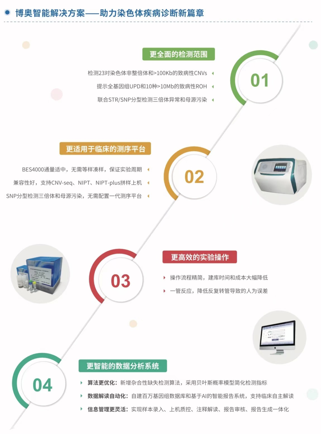 博奧晶典CNV-seq系列產(chǎn)品全面升級(jí),在原有產(chǎn)品檢測(cè)23對(duì)染色體非整倍體、100Kb以上缺失/重復(fù)的基礎(chǔ)上,新開發(fā)了特有的生信算法并獲得專利授權(quán),新增基因組純合區(qū)域ROH檢測(cè),可提示全基因組UPD和10種>10Mb的致病性ROH;此外,博奧晶典自主研發(fā)的基于BES4000的SNP分型技術(shù)有效提示三倍體異常和定量鑒定5%以上的樣本交叉污染,為臨床提供更具性價(jià)比的檢測(cè)產(chǎn)品,為出生缺陷精準(zhǔn)防控提供更全面的解決方案。