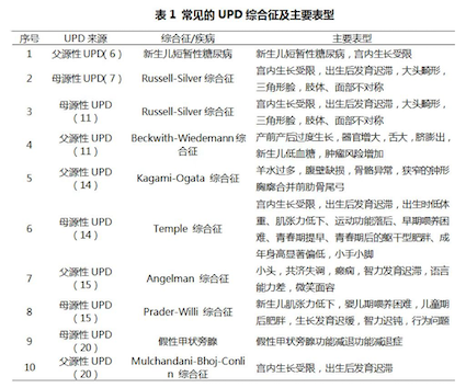 大多數(shù)染色體UPD沒(méi)有臨床表型,當(dāng)UPD發(fā)生在印記基因區(qū)域則會(huì)導(dǎo)致印記基因異常,出現(xiàn)異常的表型。目前針對(duì)上述UPD綜合征(表1)尚無(wú)有效的治療手段,因此,早發(fā)現(xiàn)、早診斷、早干預(yù)對(duì)于此類疾病的防控尤為重要。