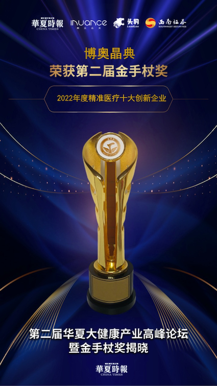 歲末年初,博奧晶典憑借在精準(zhǔn)醫(yī)療領(lǐng)域的多項(xiàng)核心專利技術(shù)和高質(zhì)量創(chuàng)新產(chǎn)品,在近日由華夏時(shí)報(bào)社、蘭州新區(qū)管委會(huì)等單位共同主辦的第二屆華夏大健康產(chǎn)業(yè)高峰論壇暨金手杖獎(jiǎng)?lì)C獎(jiǎng)盛典上喜獲“2022年度精準(zhǔn)醫(yī)療十大創(chuàng)新企業(yè)”。此次獲得2022年度精準(zhǔn)醫(yī)療十大創(chuàng)新企業(yè),是對博奧晶典科技創(chuàng)新能力的充分肯定,亦是對博奧晶典行業(yè)龍頭地位的高度認(rèn)可。